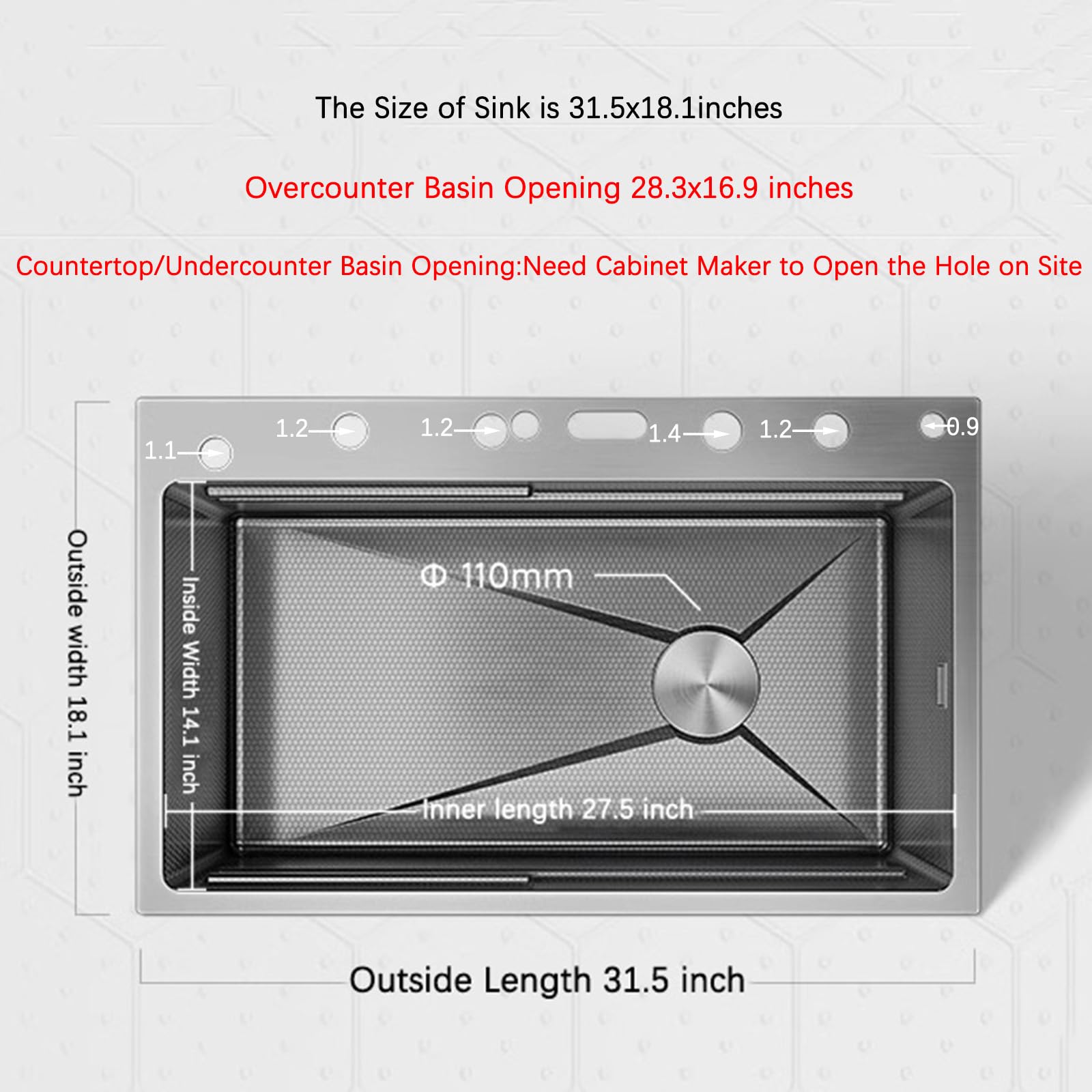 【Dimensions】: 31.5 “L x 18.1 ‘W x 8.6 ’D; Internal dimensions: 29.5 ‘L x 14.1’ W x 7.8 ”D; Slot panel thickness of 3MM (about 8 grams); Slot body 0.8mm (about 21 grams), the outer diameter of the drain 110mm, we include installation video, PDF full version of the installation tutorial